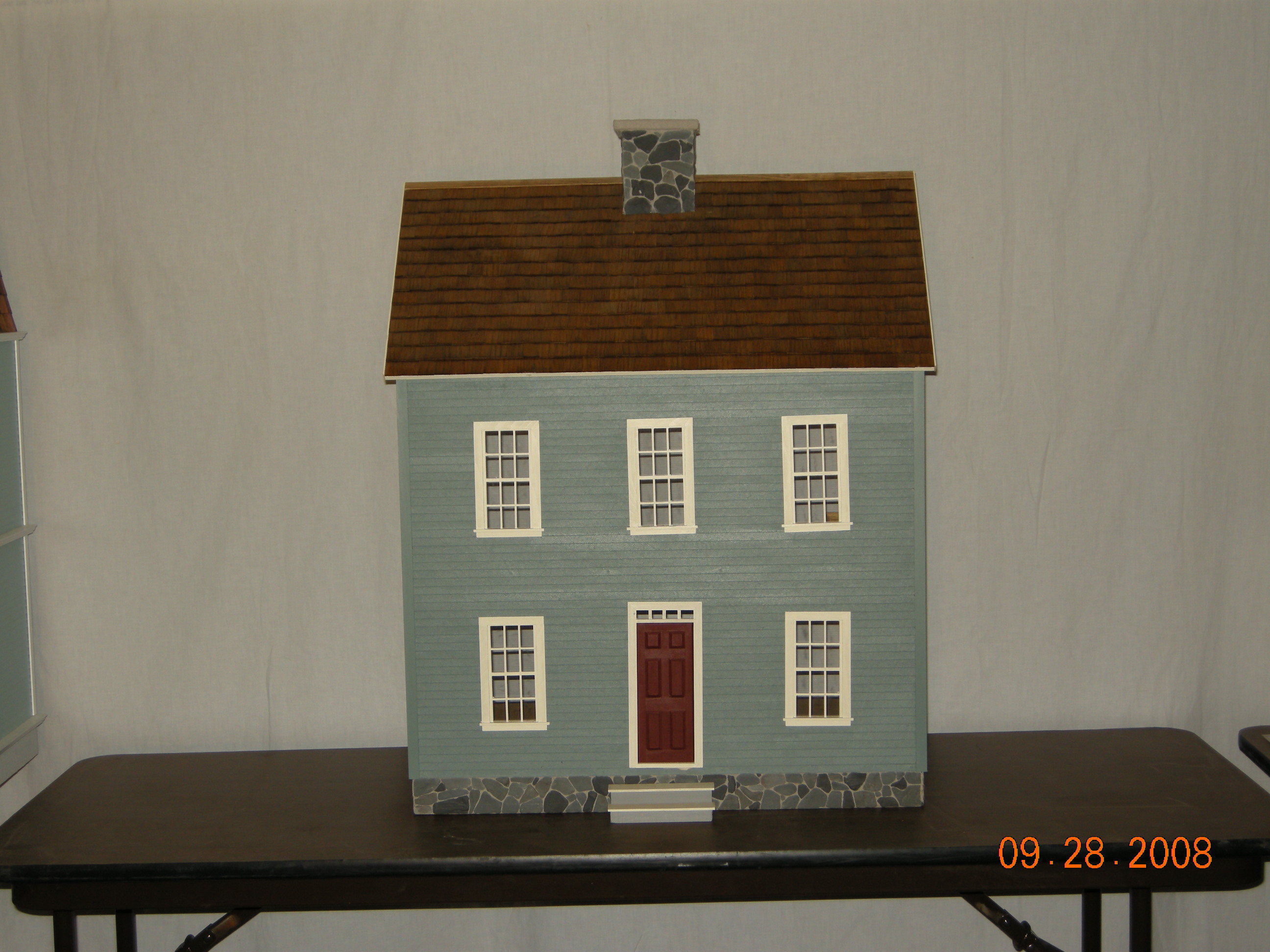 This is a Federal Colonial dollhouse, one of a kind, will not make another. Finished on the outside, painted walls and ceilings inside. Real hand cut stone work on chimney and foundation.